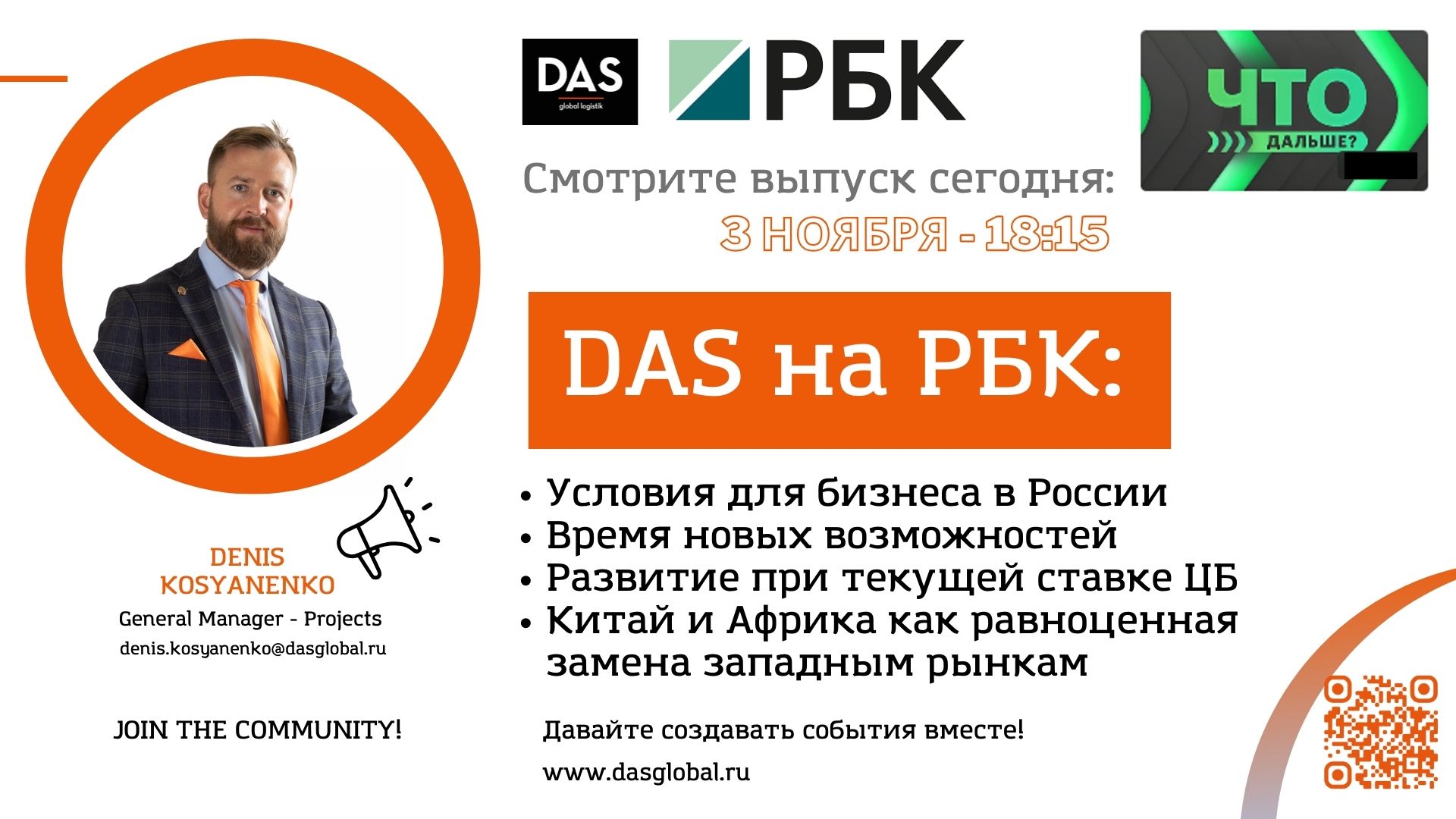СЕГОДНЯ, 3 ноября в 18:15, в программе РБК «Что дальше?» выступит эксперт в области логистики Денис Косьяненко, руководитель международного отдела по развитию бизнеса DAS GLOBAL LOGISTIK и ответит на важные вопросы актуальных тем в логистике и в мире: 1. Условия для бизнеса в России, 2. Время новых возможностей, 3. Развитие при текущей ставке ЦБ, 4. Китай и Африка как равноценная замена западным рынкам